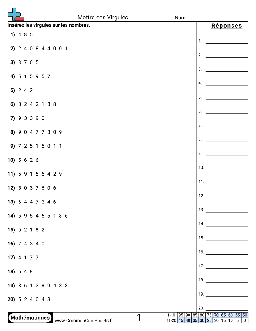 Fiches gratuites de math sur Mettre des Virgules. Chaque fiche contient 20 exercices avec corrigé et convient aux enseignants et à l'enseignement à domicile. Vous pouvez télécharger le PDF, créer des cartes mémoire ou l'utiliser pour l'apprentissage en ligne.