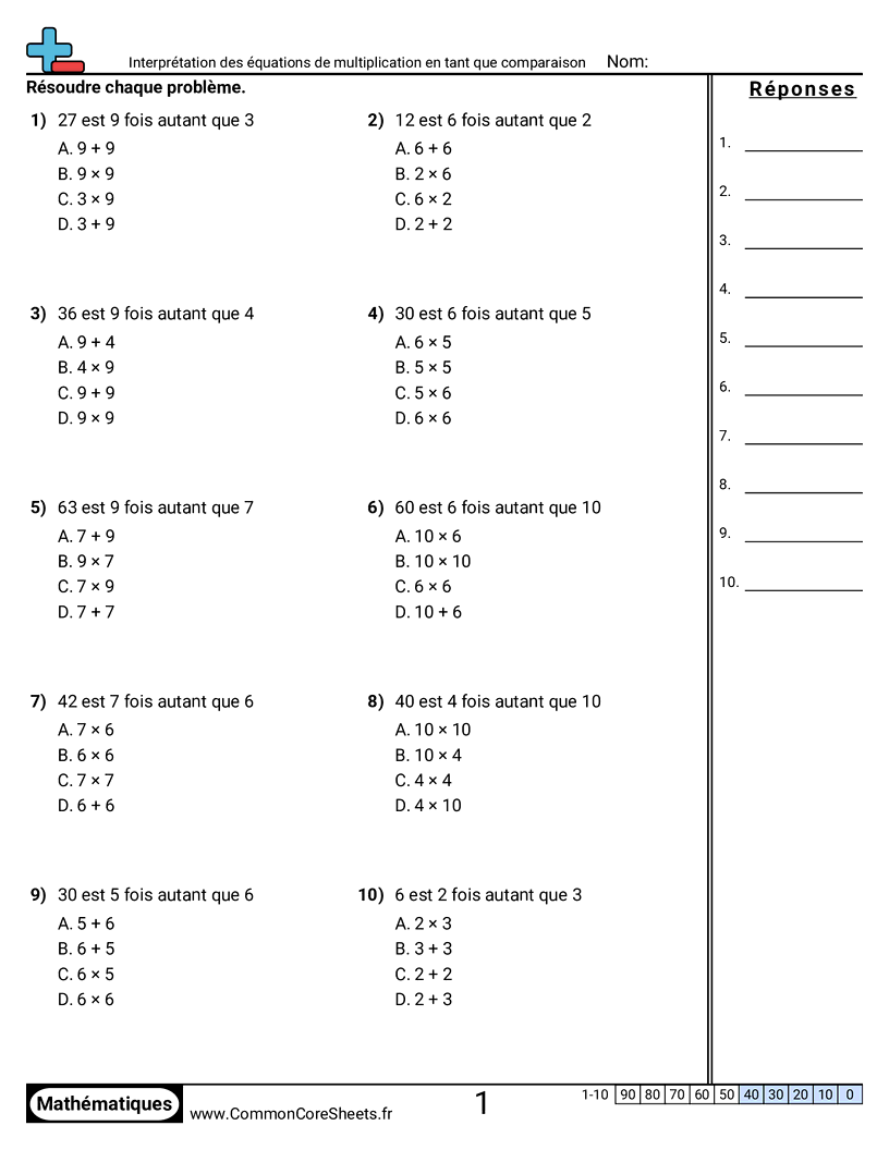 Fiches gratuites de math pour CM1 (4oa1) sur Interprétation des équations de multiplication en tant que comparaison. Chaque fiche contient 10 exercices avec corrigé et convient aux enseignants et à l'enseignement à domicile. Vous pouvez télécharger le PDF, créer des cartes mémoire ou l'utiliser pour l'apprentissage en ligne.