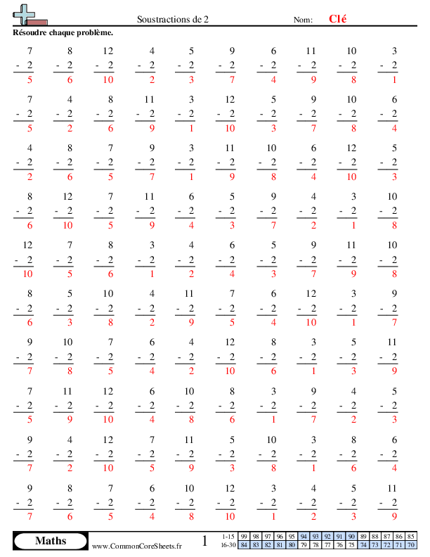 Les fiches de soustraction sont un outil important pour aider les élèves à apprendre et à pratiquer la soustraction. Ces fiches peuvent être utilisées en classe ou à la maison, et sont disponibles pour une variété de niveaux scolaires. Nos fiches de soustraction couvrent les faits de base de la soustraction, la soustraction à plusieurs chiffres, la soustraction avec regroupement (emprunt) et plus encore. Chaque fiche de soustraction comporte un ensemble de problèmes que les élèves doivent résoudre avec de l'espace pour montrer leur travail, et des clés de réponse sont fournies. En plus des fiches de soustraction, nous proposons également des cartes mémoires imprimables pour la soustraction et des devoirs en ligne pour aider davantage les élèves à pratiquer leurs compétences en soustraction.