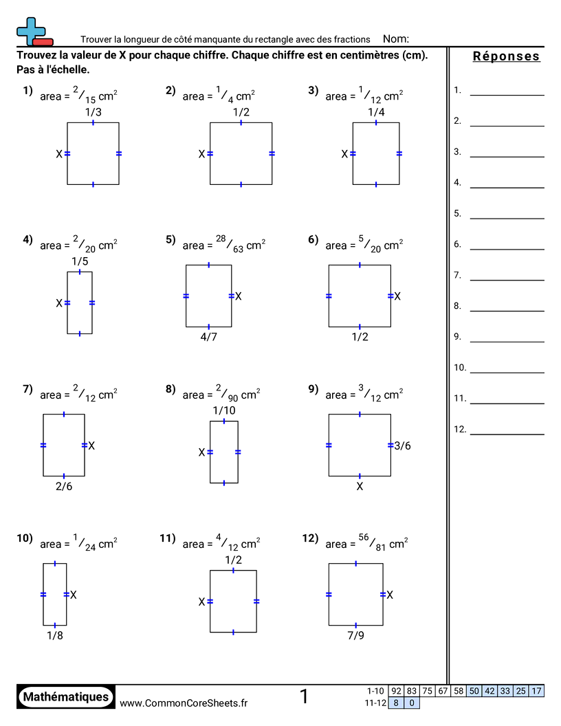 Fiches gratuites de math sur Trouver la longueur de côté manquante du rectangle avec des fractions. Chaque fiche contient 12 exercices avec corrigé et convient aux enseignants et à l'enseignement à domicile. Vous pouvez télécharger le PDF, créer des cartes mémoire ou l'utiliser pour l'apprentissage en ligne.