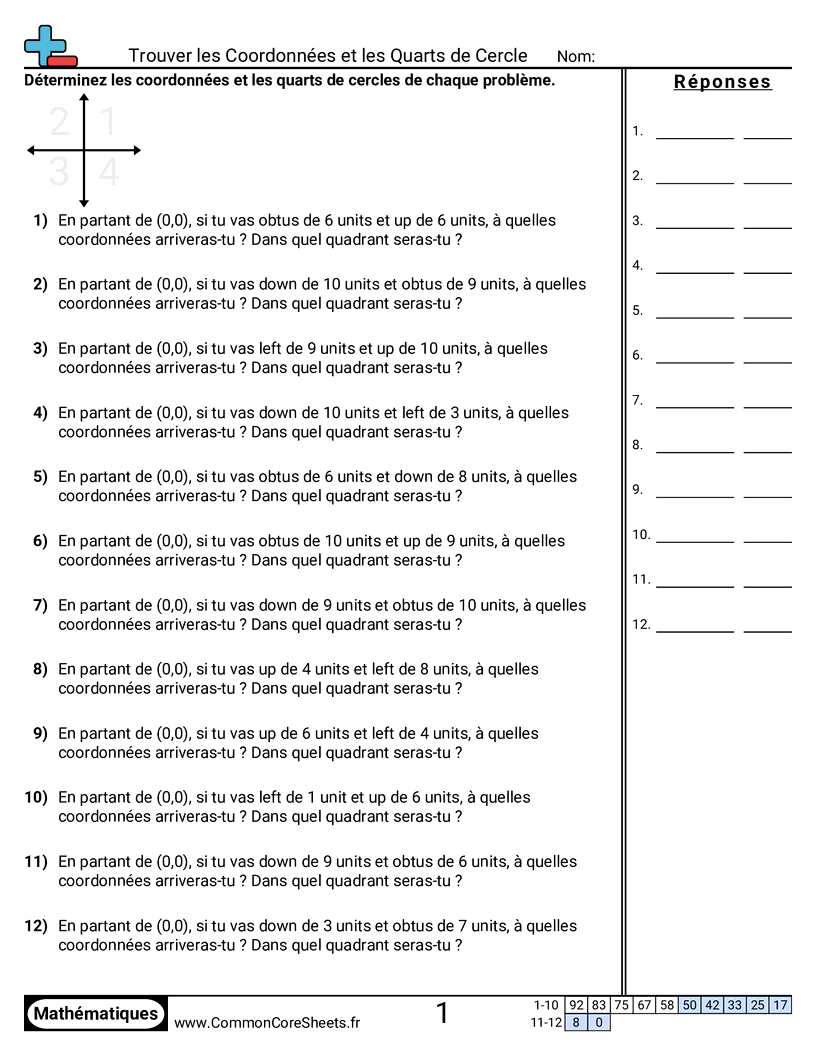 Fiches gratuites de math pour 6ème (6ns6b) sur Trouver les Coordonnées et les Quarts de Cercle. Chaque fiche contient 12 exercices avec corrigé et convient aux enseignants et à l'enseignement à domicile. Vous pouvez télécharger le PDF, créer des cartes mémoire ou l'utiliser pour l'apprentissage en ligne.