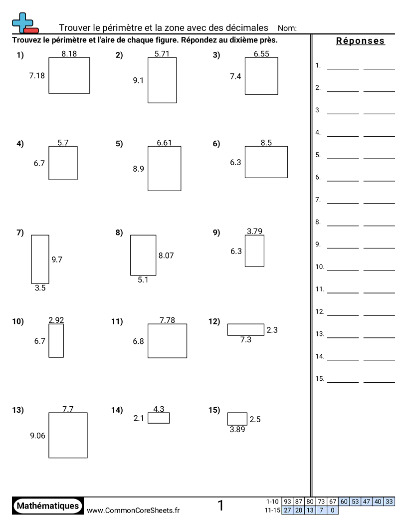 Fiches gratuites de math sur Trouver le périmètre et la zone avec des décimales. Chaque fiche contient 15 exercices avec corrigé et convient aux enseignants et à l'enseignement à domicile. Vous pouvez télécharger le PDF, créer des cartes mémoire ou l'utiliser pour l'apprentissage en ligne.