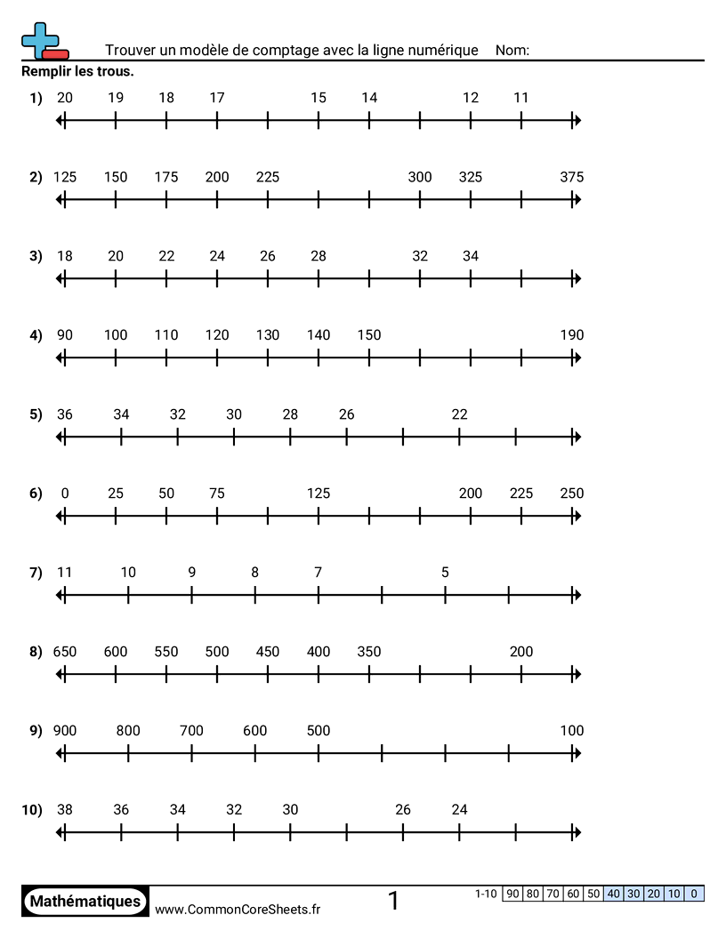 Fiches gratuites de math sur Trouver un modèle de comptage avec la ligne numérique. Chaque fiche contient 10 exercices avec corrigé et convient aux enseignants et à l'enseignement à domicile. Vous pouvez télécharger le PDF, créer des cartes mémoire ou l'utiliser pour l'apprentissage en ligne.